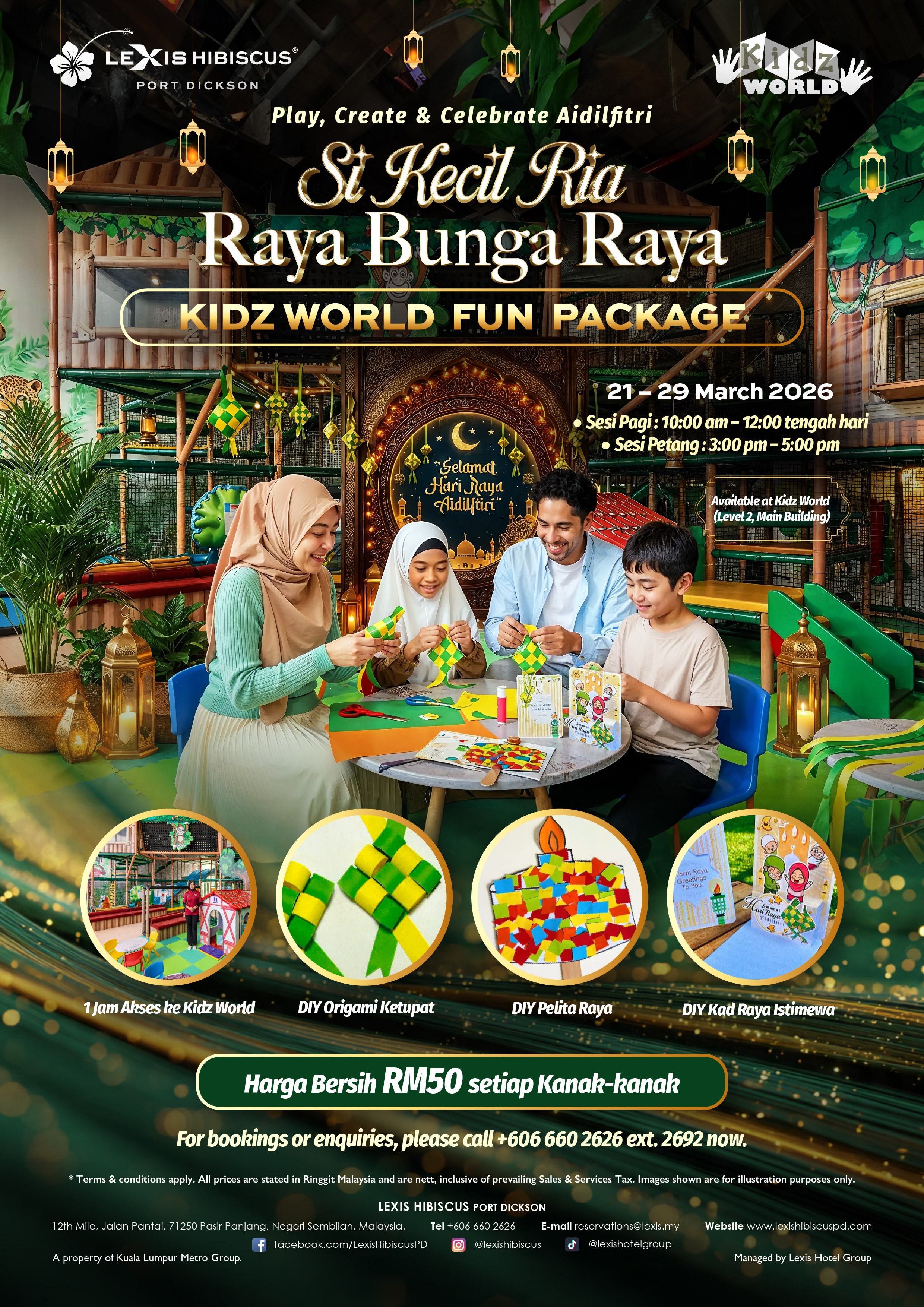 Let your little ones celebrate Aidilfitri with joy, creativity, and meaningful Raya traditions at Kidz World (Level 2), Lexis Hibiscus Port Dickson! From 21–29 March 2026, kids can enjoy 1 hour of playtime plus a festive hands-on craft journey—fold a DIY Origami Ketupat, create a glowing Pelita Raya, and design a heartfelt Kad Raya Istimewa to share love and gratitude this Syawal.